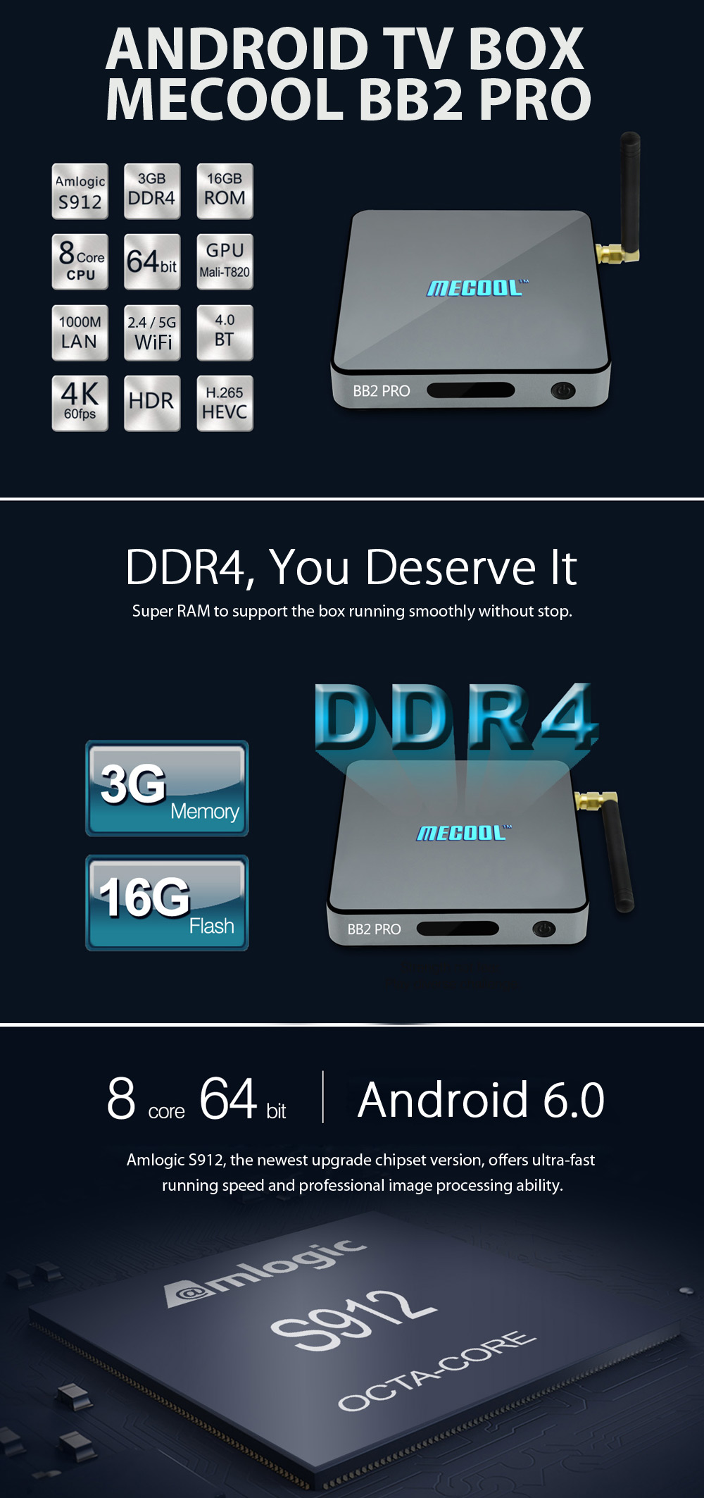 Мощная ТВ медиа приставка TV BOX "Mecool BB2 Pro" Amlogic S912 Octa core Android 6.0 DDR4 3 г 16 г UHD 4 К Wi-Fi Gigabit LAN!