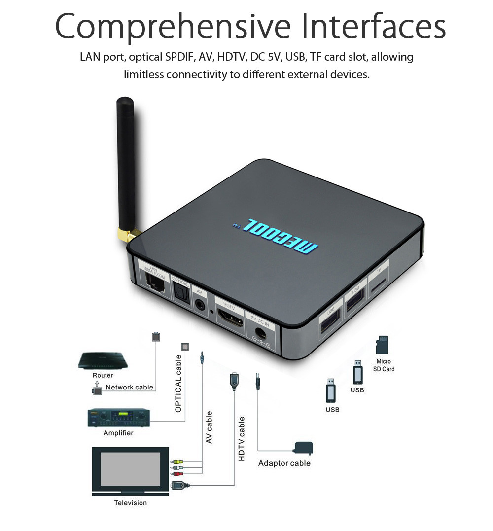 Содержание: 1 X ТВ коробка, 1 x HDMI кабель, 1 x дистанционное управление, 1 x мощность адаптер, 1 х руководство пользователя, 1 х Wi-Fi телевизионные антенны
