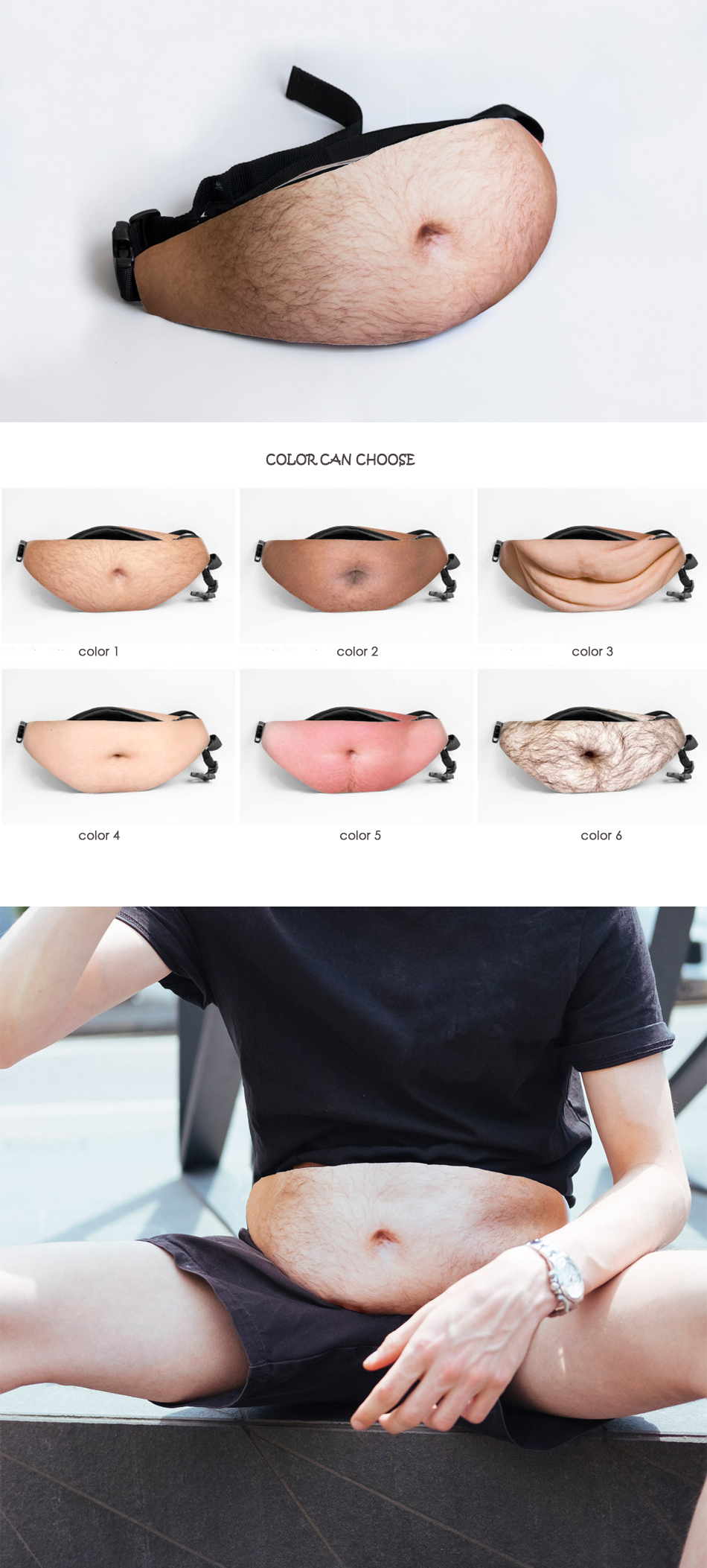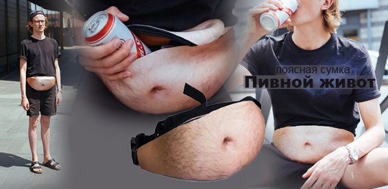 Как получить все преимущества от его обладания, но при этом сохранить стройность? Поясная сумка с принтом в виде волосатого животика с пупком создаёт у окружающих убедительную 3D-иллюзию того, что владелец сумки обладает им на самом деле. Сходство ещё более усиливается, если сумка носится поверх одежды.