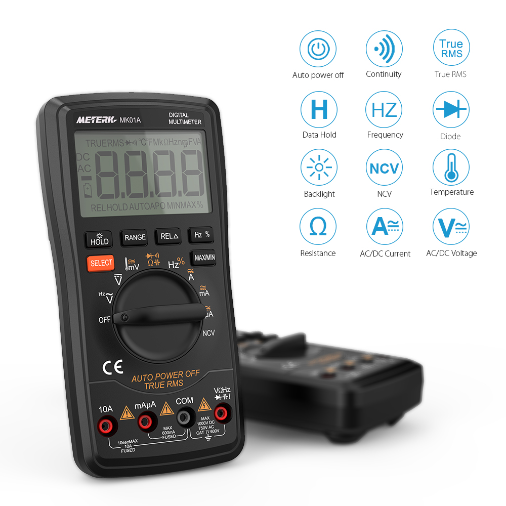 Функция: режим удержания, подсветка, авто мощность off, НТС тесты, частота тесты, температура измерения, зуммер непрерывности тесты с ЖК-дисплей, защита от перегрузки, защита от короткого замыкания, транзистор, диод тесты