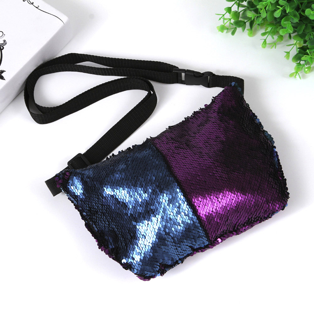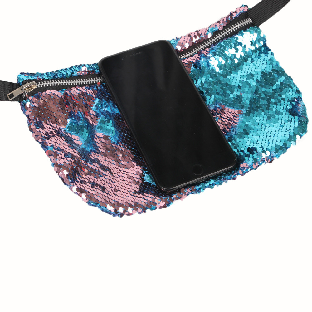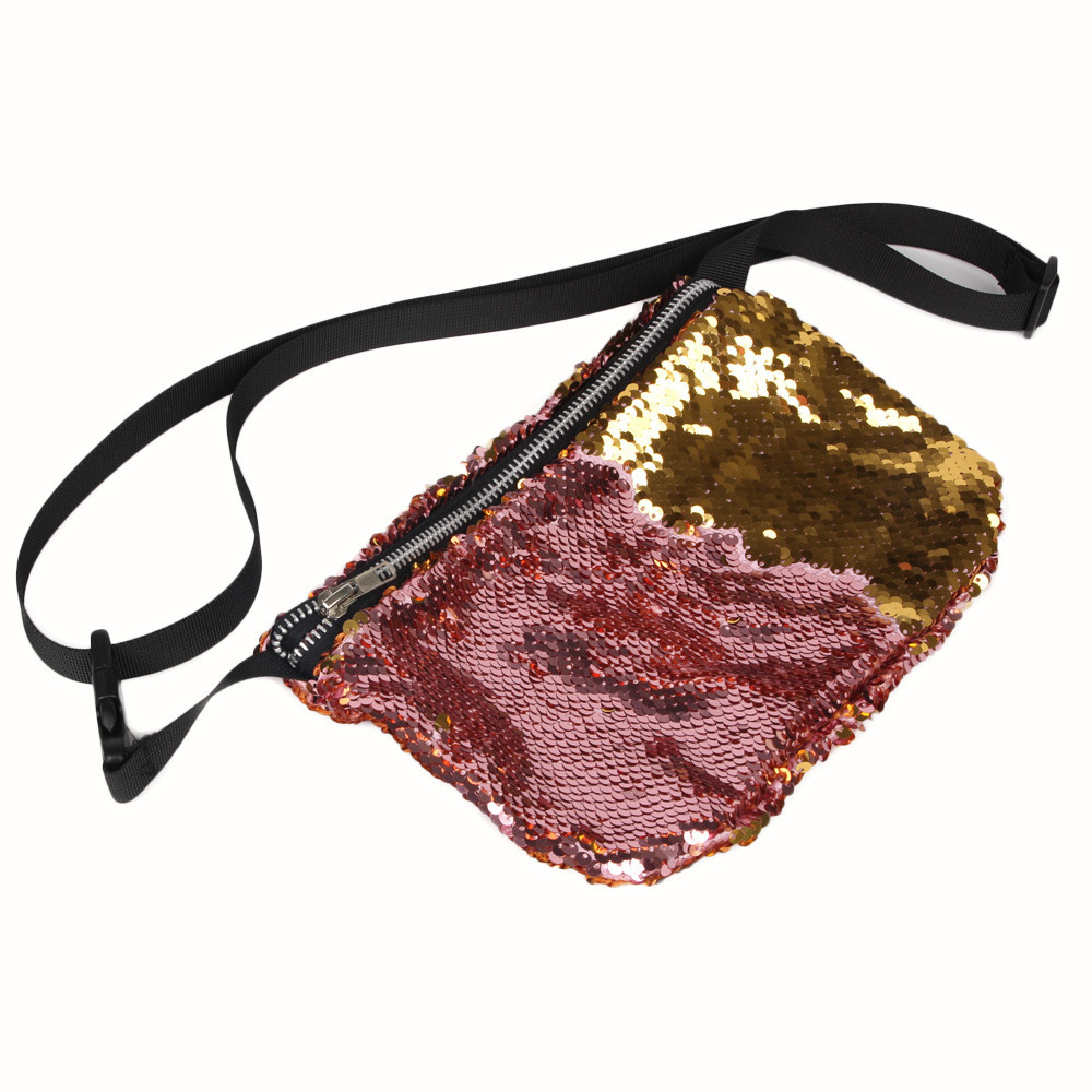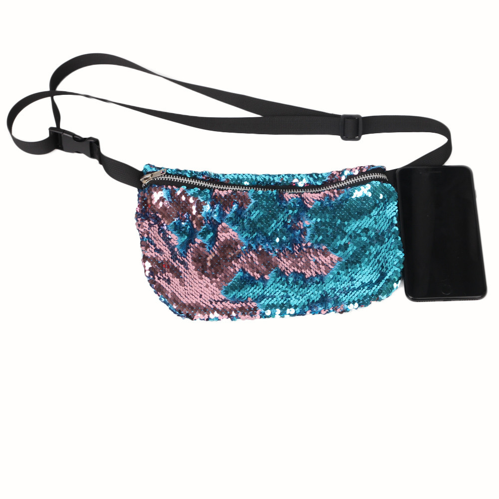 Разноцветная поясная сумка с пайетками контрастных цветов, серебристыми металлическими деталями, подкладкой и застежкой на молнии.