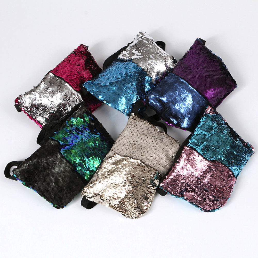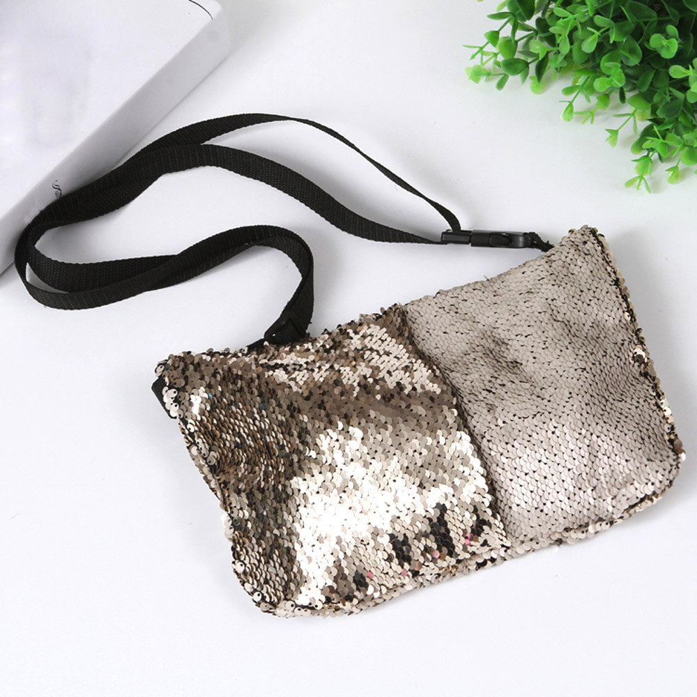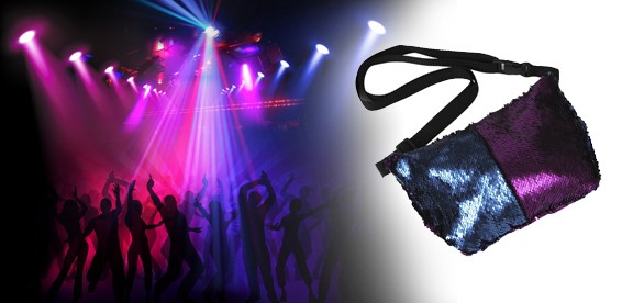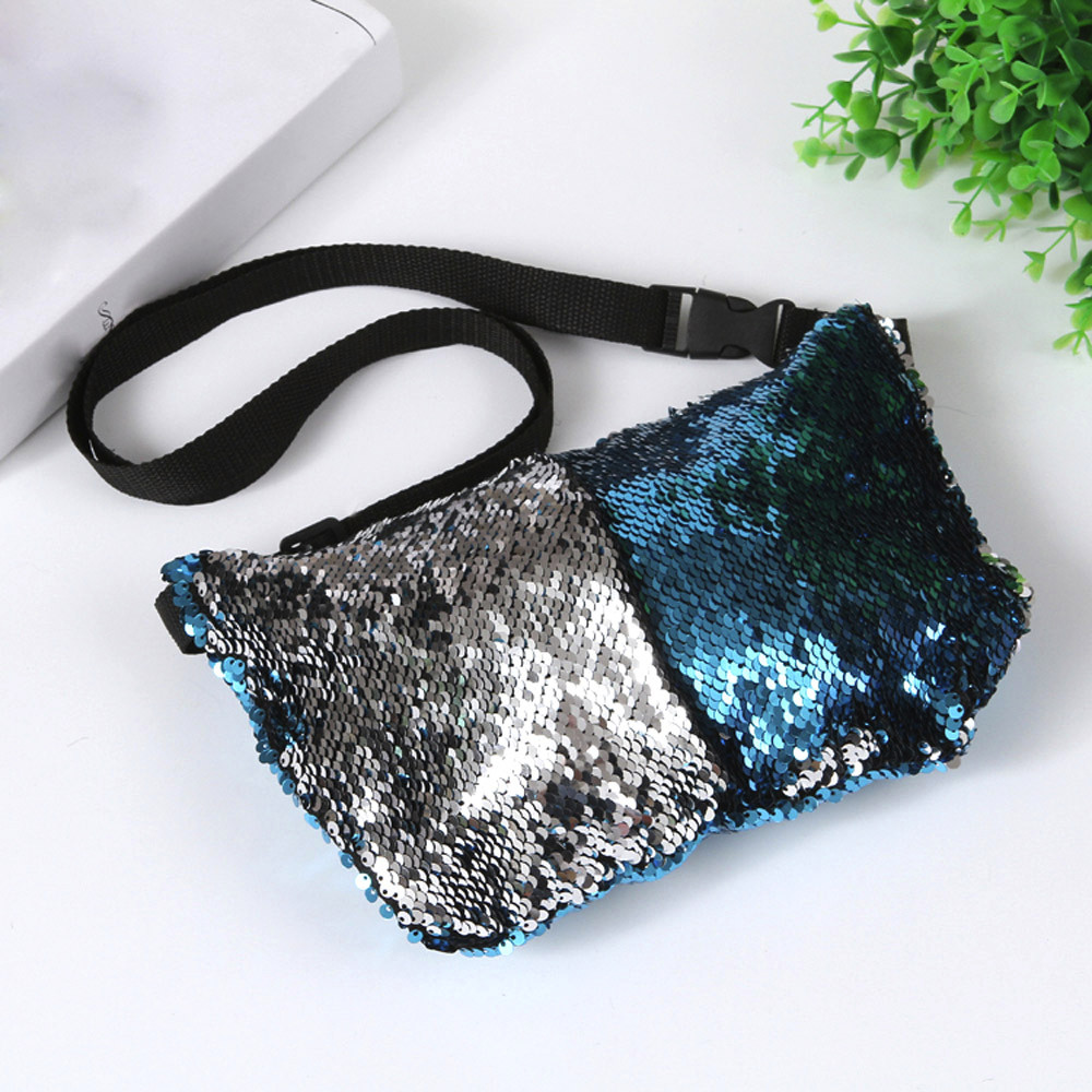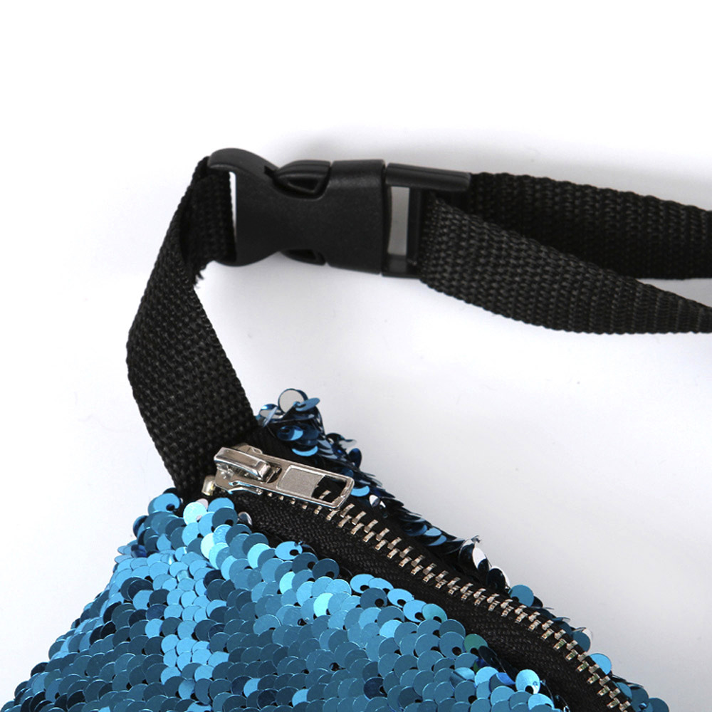 Разноцветная поясная сумка с пайетками контрастных цветов, серебристыми металлическими деталями, подкладкой и застежкой на молнии.