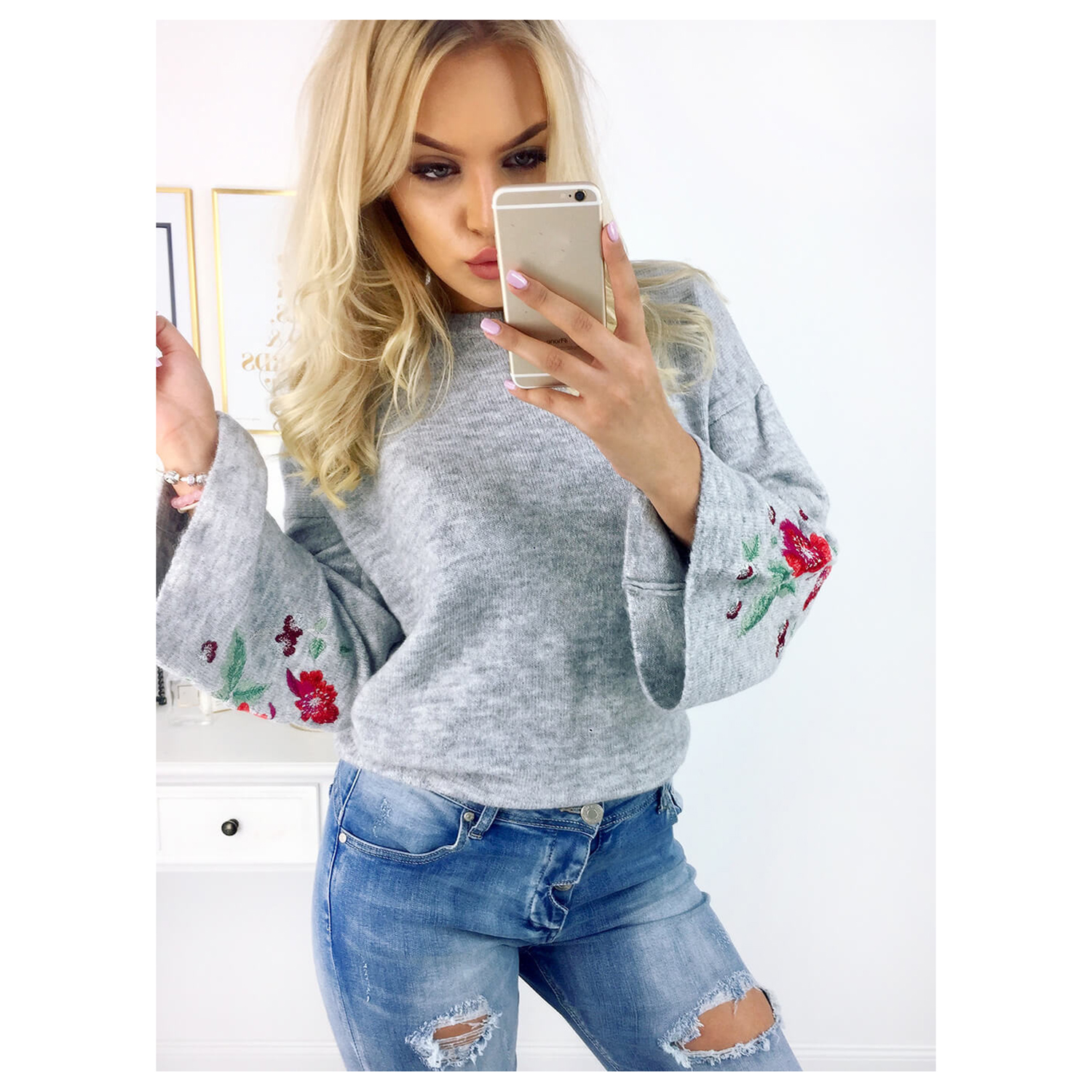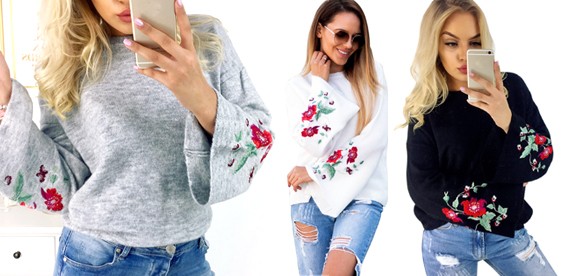 Свитер с рукавами-клеш и цветочной вышивкой. Воротник с О-образным вырезом, материал полиэстер.