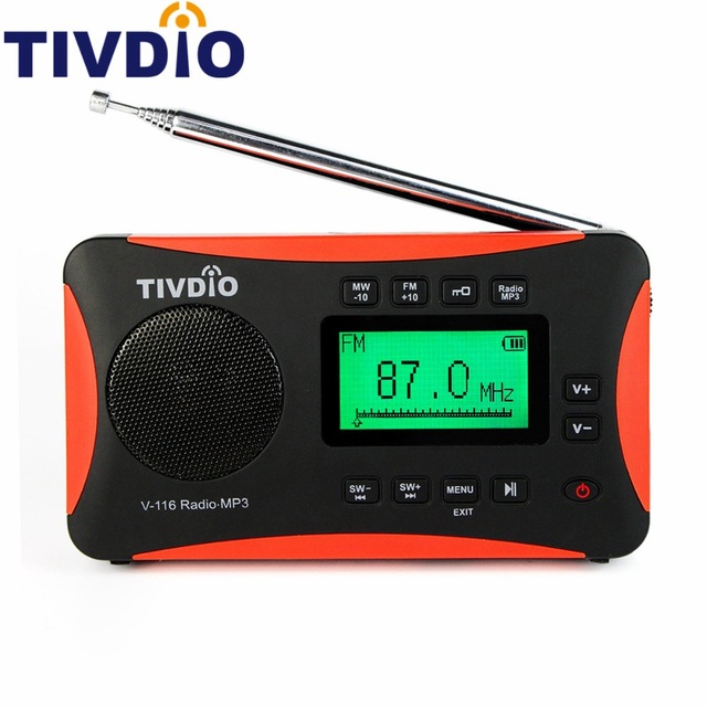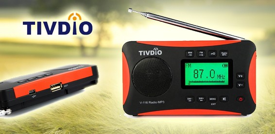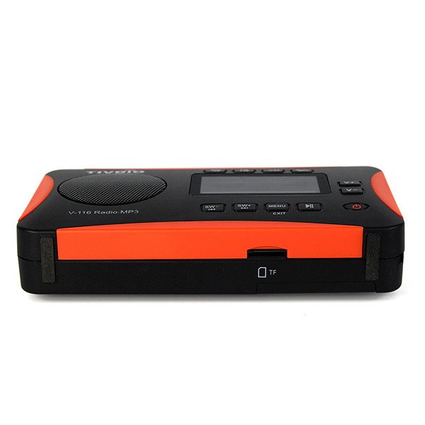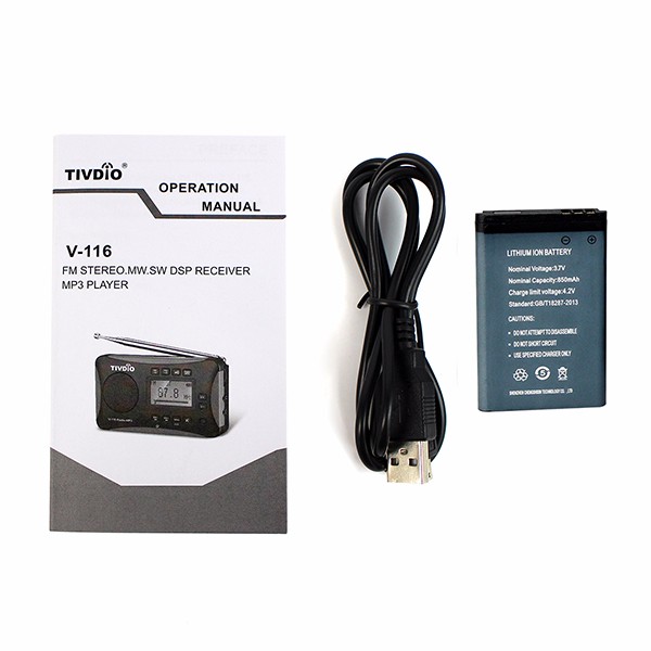 Радиоприемник TIVDIO V-116. Тюнер цифровой. Всеволновой, диапазоны fm, mw, sw. Прием звука в формате стерео в трех диапазонах ФМ. Память на 60 радиостанций. Часы, будильник. Питание аккумулятор или от microUSB.