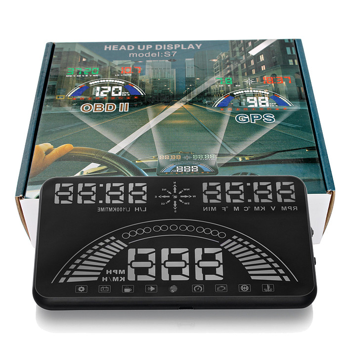 HUD проектор S7 проецирует наиболее важную информацию на лобовое стекло автомобиля (скорость, обороты, температура, заряд аккумулятора, расход топлива) на уровне глаз водителя и специально разработан для повышения безопасности. Водителю не нужно отвлекаться от дорожной ситуации, вся необходимая информация всегда перед глазами.