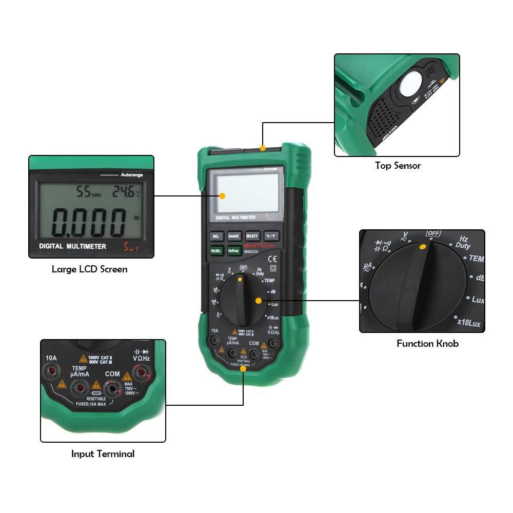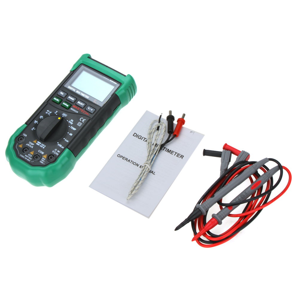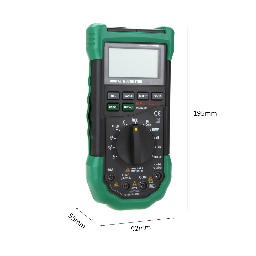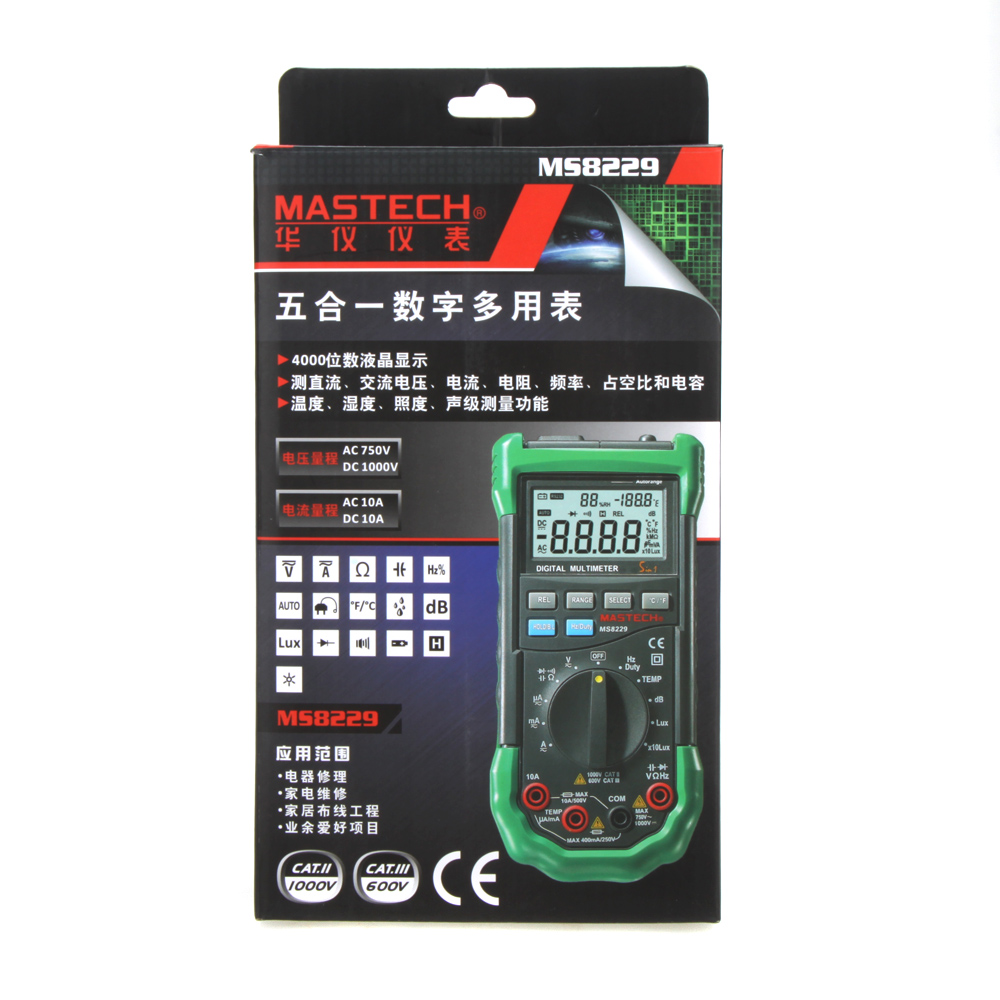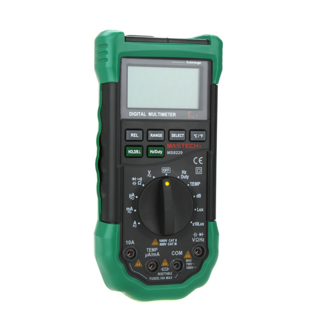 Мультиметр Mastech MS8229 –данный прибор разработан для широкой сферы применения, идеально подходит для работы в мастерских, образовательных учреждениях, для хобби. MS8229 создан как многофункциональный измерительный прибор, который включает в себя стандартный набор измерений и несколько специальных. Корпус MS8229 выполнен из высококачественного, приятного на ощупь, пластика. Корпус немарок, легко очищается от загрязнений. Смоделирован MS8229 таким образом, чтобы его было удобно использовать одной рукой. В центре лицевой части MS8229 размещён поворотный переключатель, выше поворотного переключателя находятся функциональные кнопки. Внизу расположены гнёзда под измерительные щупы. На верхней части корпуса расположены датчики температуры и влажности, динамик. Отображение проводимых измерений на MS8229 обеспечивает 3 полосный ЖК-дисплей, одновременно показывающий результат измерения и символ единиц измерения, максимальное отображаемое значение которого 3999. Мультиметр Mastech имеет индикацию отрицательного значения проводимого измерения, индикацию перегрузки, а также индикатор разряда батареи. Расположенные сверху лицевой части MS8229 кнопки «HOLD/B.L», «RANGE», «REL», «Hz/DUTY», «SELECT» и «°С/°F» позволяют более полно работать с мультиметром.