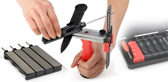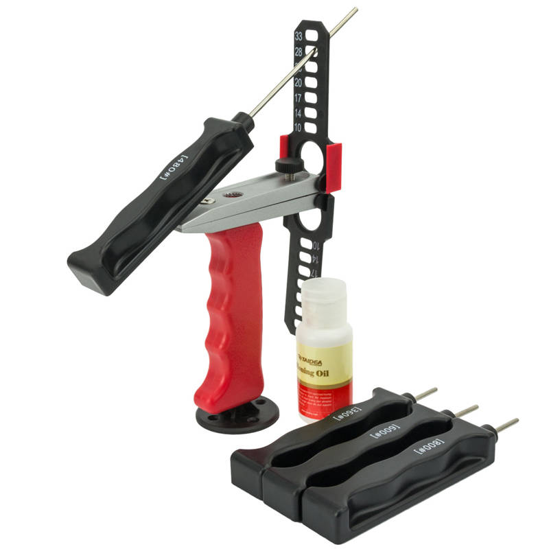 Он содержит полный набор инструментов, необходимых для ухода за ножами, и будет по достоинству оценен профессионалами. Одним из плюсов этого набора, выгодно отличающем его от конкурентов, является большая плошадь точильного камня, обеспечивающая дополнительное удобство при работе. Точить ножи с помощью этого набора очень легко, камень не требует сильного нажима. Все инструменты, входящие в набор, быстро собираются и разбираются.