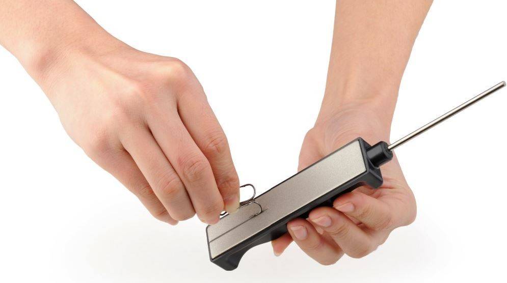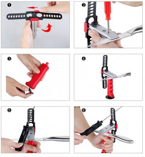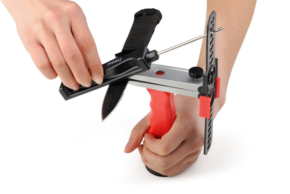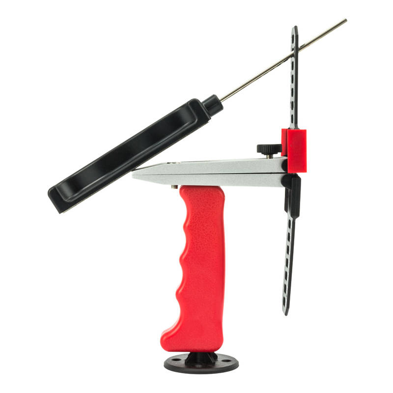 Ослабьте передний винт зажима для клинка и установите нож в зажим (лезвием в сторону от вертикальных направляющих-пластин) и надежно зафиксируйте его. Затем затяните задний винт с черной пластиковой головкой, если это необходимо для более надежной фиксации клинка в зажиме устройства.