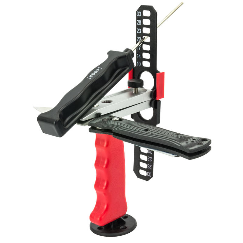 Раскройте и зафиксируйте пластины (направляющие) с размеченными отверстиями угла заточки и зафиксируйте их с помощью сдвижных замков. Убедитесь, что пластины (направляющие) находятся на одной прямой линии и строго вертикально относительно зажима для клинка.
