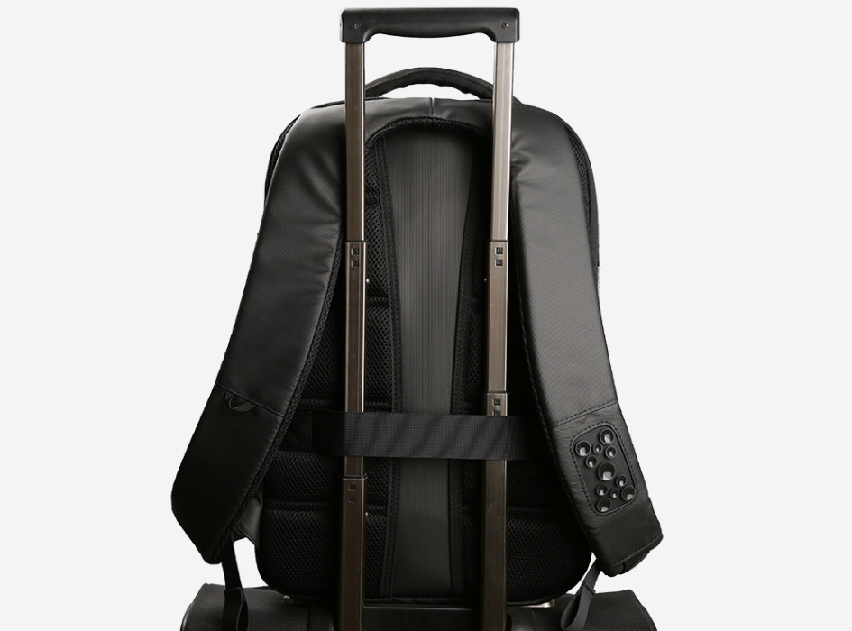 Благодаря продуманной лямке на спинке рюкзака, его очень удобно крепить на ручку чемодана.