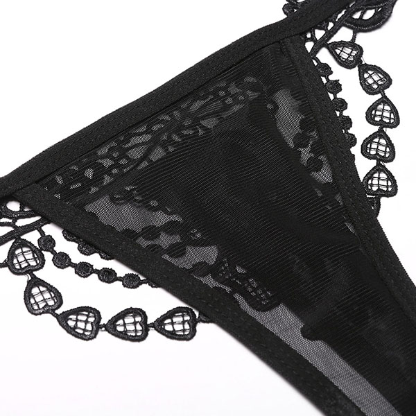 Трусики декорированы аккуратным тонким кружевом. Нижнюю часть прикрывают лишь две эластичные полоски.