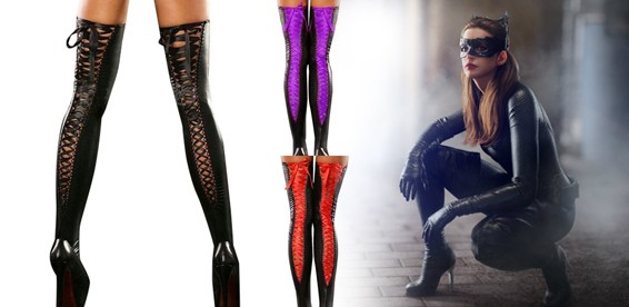 Черные игривые чулки из искусственной кожи. Красиво украшены сзади тонкой атласной лентой чёрного, красного или фиолетового цвета. Размер универсальный, длина изделия 88 см.