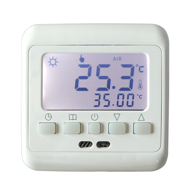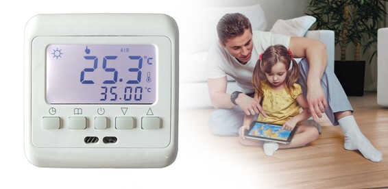 Комнатный программируемый терморегулятор со встроенным датчиком температуры воздуха и выносным датчиком температуры пола. Большой графический дисплей с подсветкой и кнопками управления. Наличие встроенного меню. Встроенный монтаж. Многорежимный терморегулятор : постоянное поддержание комфортной температуры, суточный цикл, недельный цикл. Датчик пола входит в комплект. 16 А.