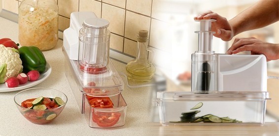 Берете все что можно сунуть в дырку контейнера, кладете в контейнер, сверху прижимаете удобным поршнем-толкателем и нажимаете кнопочку. База начинает двигаться туда-сюда и трет о лезвие. А вы давите на поршень. До конца. Через несколько мгновений огурец порублен на мелкие кольца.