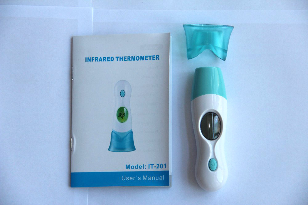Комплектация : термометр – 1 шт., насадка для измерения в лобной части головы – 1 шт., колпачок – 1 шт., подставка – 1 шт., инструкция на англ.яз. – 1 шт.