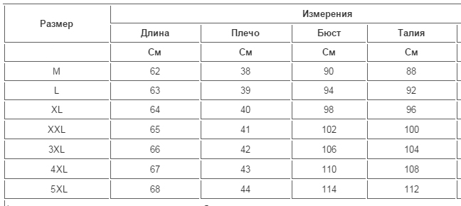 Размер: M, L, XL, XXL, XXXL, 4XL, 5XL