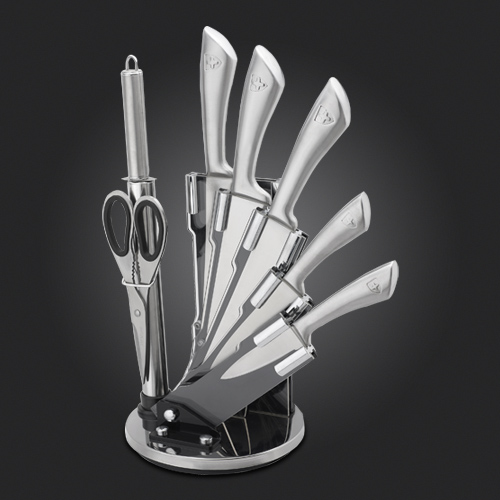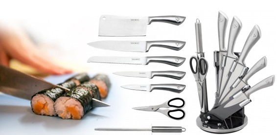 В комплектах ножей: - 5 ножей - овощечистка - точилка - ножницы - подставка -материал высококачественная нержавеющая сталь