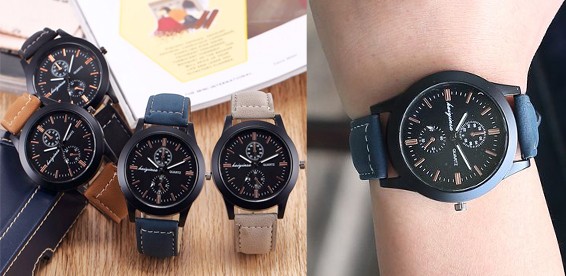 Модные мужские кварцевые часы, в стильном черном корпусе из нержавеющей стали на ремешке из кожи.