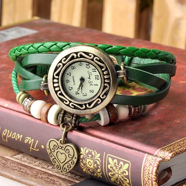Стильные винтажные часы на кожаном ремне с оригинальной плетенной шнуровкой и брелком в виде листочка, бабочки или сердечка. Идеальный летний аксесcуар для настоящей модницы!