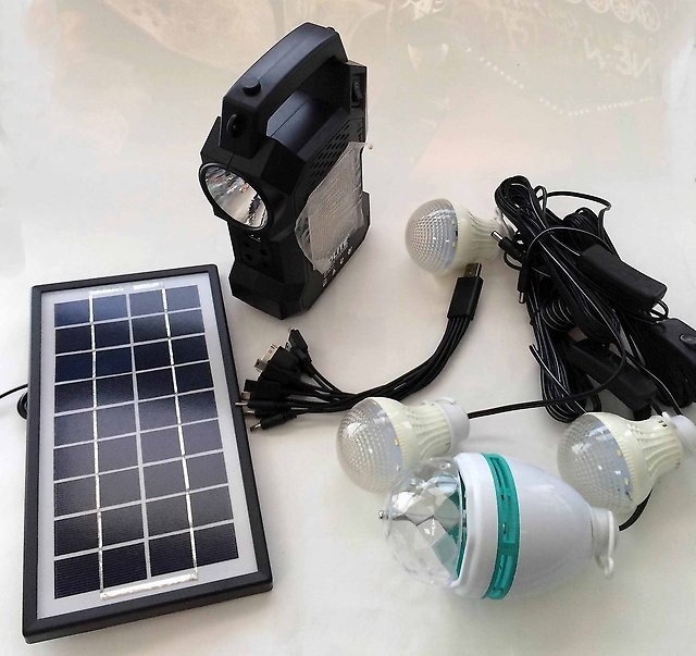GDLITE GD-8050, свинцово-кислотный аккумулятор емкостью 6В 4Ач с возможностью подзарядки от сети 220В или от солнечной панели. Укомплектован солнечной панелью, тремя мощным LED лампами и одной диско лампой, также в комплекте USB кабель с 10 различными переходниками для зарядки устройств.Сам блок питания оснащен светодиодной панелью и фонарем.