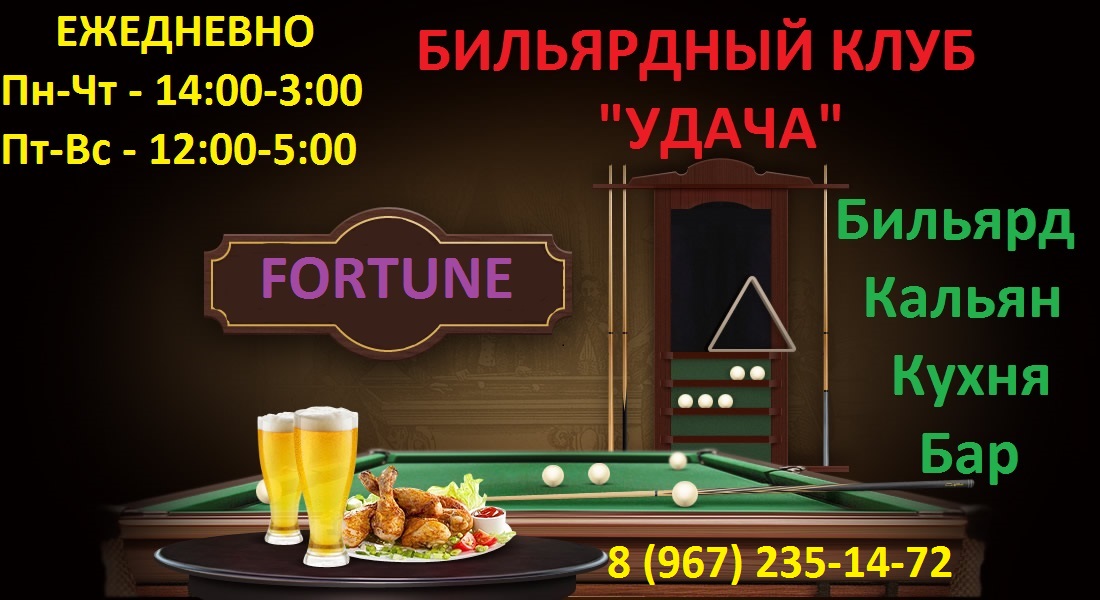Скидка 50% на игру в бильярд в клубе «УДАЧА» на Сходненской: купон 50 руб. + доплата на месте: Русская пирамида с Пн - Чт: 12-футoв: 14:00-18:00 – 100 руб/час 18:00-3:00 – 150 руб/час 10-футoв: 14:00-18:00 – 50 руб/час 18:00-3:00 – 100 руб/час Американская пирамида с Пн-Чт: Пул: 14:00-18:00 – 50 руб/час 18:00-3:00 – 75 руб/час Русская пирамида с Пт - Вс: 12-футoв: 14:00-18:00 – 125 руб/час 18:00-5:00 – 175 руб/час 10-футoв: 14:00-18:00 – 75 руб/час 18:00-5:00 – 125 руб/час Американская пирамида с Пт - Вс: Пул: 14:00-18:00 – 75 руб/час 18:00-5:00 – 100 руб/час |