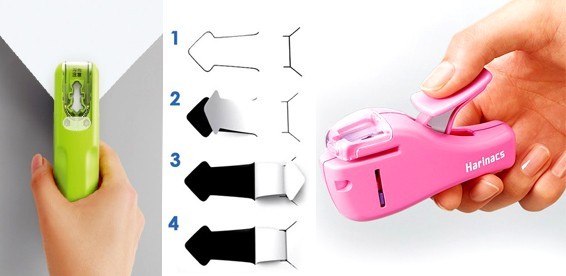Kokuyo Harinacs, так называется это скрепляющее чудо, работает по принципу оригами, бумага скрепляется бумагой. Нажимая на рычаг степлера, вы вырезаете в скрепляемых листах бумаги продолговатое отверстие. Образовавшиеся кончики бумаги загибаются и все вместе протаскиваются в еще одну прорезь, фиксируя самих себя. Держатся они прочно, но сколько-нибудь толстую пачку бумаги скрепить таким образом не получится. Kokuyo Harinacs рассчитан на 8, максимум 10 листов. Скрепить тонкую бумагу, типа папиросной, или термобумагу таким способом тоже не получится — листы оказываются слишком скользкими и вместе не держатся.