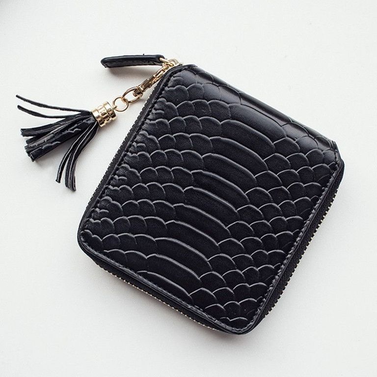 Женский кошелек из искусственной кожи, с принтом под рептилию, закрывается на молнию, украшенную кисточкой. Имеет отделения для карточек и денег, карман для мелочи на кнопке. Размеры: 10,5 см*12 см. Производство - Китай.
