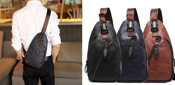 Мужской рюкзак-слинг из искусственной кожи, застегивается на молнию. Имеет регулируемый плечевой ремень, внутренние карманы и наружные. Размеры: длина - 18 см, ширина - 5 см, высота - 31 см. Производство - Китай.