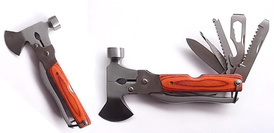 Многофункциональный инструмент включает в себя молоток, топор, нож, пила, открывалка, отвертка, плоскогубцы.