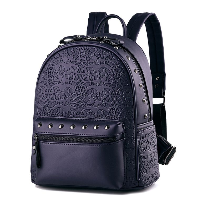 Женский рюкзак с рельефным узором из искусственной кожи, украшен конусовидными шипами. Имеет внутренние и внешний накладной карманы, регулируемые плечевые ремни. Размеры: длина - 26 см, ширина- 13 см, высота - 29 см. Производство - Китай.