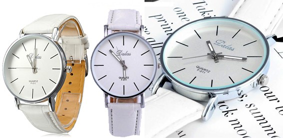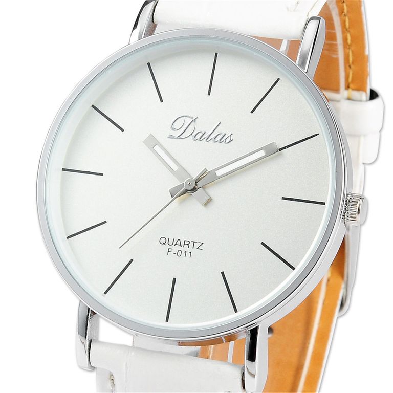 Женские белые кварцевые часы Dalas F-011 на регулируемом ремешке из качественной искусственной кожи, длинной 23 см. Имеют корпус из нержавеющей стали диаметром 4 см и шириной 0,8 см, аналоговый дисплей без цифр. Отлично подойдут в качестве подарка.