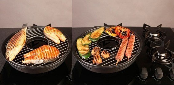 Приготовление происходит за счет конвекции горячего воздуха под крышкой гриля. Гриль необходимо установить на конфорку,диаметр конфорки должен быть меньше диаметра отверстия в нижней части сковороды. Зажгите огонь, сделав минимально средний уровень пламени. На решетку гриля выложите ваш продукт.накройте крышкой и все. Продукт готовиться без добавления масла. Продукт не нужно переворачивать. Отсутствует прямой контакт продукта с нагреваемой поверхностью что облегчает уход за сковородой (продукты не пригорают).