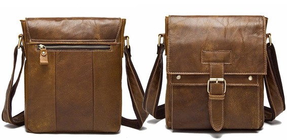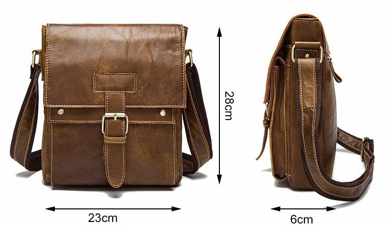 Мужская сумка из натуральной кожи на плечо. Застегивается на молнию и крышку-клапан на магните. Имеет регулируемый плечевой ремень, внутренние карманы. Снаружи на передней стороне имеет накладной карман, а сзади горизонтальный на молнии. Размеры: длина - 23 см, ширина - 6 см, высота - 28 см. Производство - Китай.
