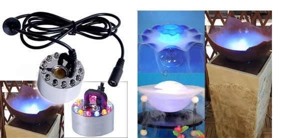 Предлагаемый туманообразователь это небольшой механизм (диаметром 5см, высотой 2,5см) в металлическом корпусе, который опускают под воду на глубину около 2,5 ~ 3.5см. Он создает ультразвуковые волны, которые излучаются преобразовательной пластиной мембраной. Эти волны распыляют воду над пластиной и создают на поверхности пелену тумана, которая стелется над настольным фонтаном. Работа туманообразователя через какое-то время может ухудшиться из-за образования минеральных отложений на пластине. Их достаточно легко удалить, отвинтив стопорное кольцо. После чего можно почистить.