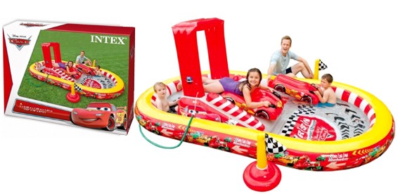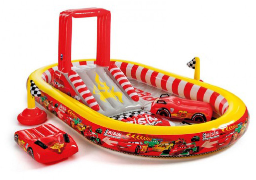 Игровой центр вмещает в себя до 636 литров воды. Установить его можно на ровной поверхности, и это не займет у Вас много времени. В комплект входит горка, два надувных флажка, две надувные доски в форме машинок. Бассейн оборудован мягкой воздушной подкладкой в его передней части, для смягчения съезда с горки. Такой подарок без сомнений порадует Вашего ребенка.