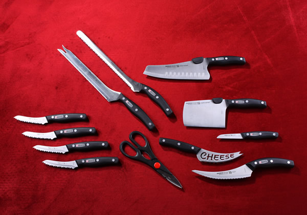В наборе собрано 12 ножей и пара кухонных ножниц. У всех предметов удобные эргономические ручки, которые позволяют быстро нарезать продукты на разных поверхностях.