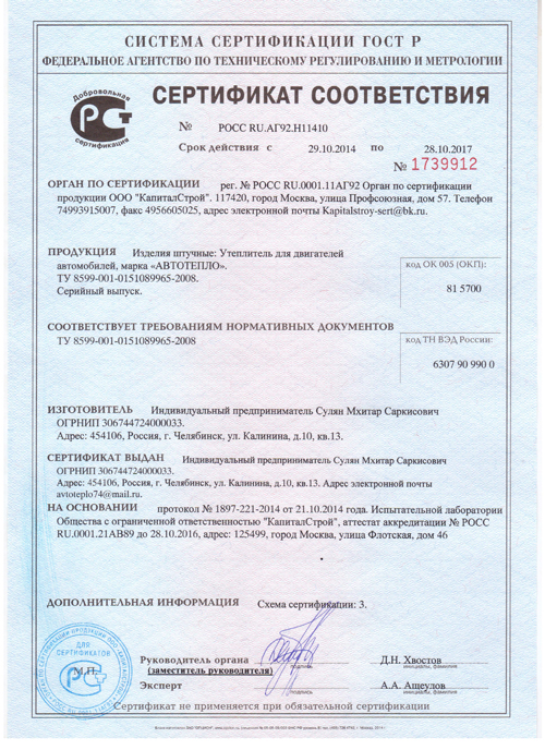 Комплект содержит в себе: пакет, утеплитель для двигателя Автотепло и технический паспорт.