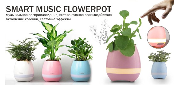 для цветов Smart Music Flowerpot. Он воспроизводит музыку при соприкосновении человека с листьями растения. Обладает встроенной bluetuth