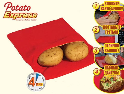 Пакеты «Картофель Экспресс» элементарны в использовании – прочтите инструкцию чуть ниже – и цена тоже скорее позабавит вас, чем озадачит. Интернет-магазин готов прислать пакеты для запекания для вас, а также рекомендует их как отличную идею для подарка женщине. Впрочем, почему именно женщине? Мужчины не меньше любят печёную картошку, и теперь смогут угостить ею любимых – благо, для этого не нужно долго учиться кулинарии.