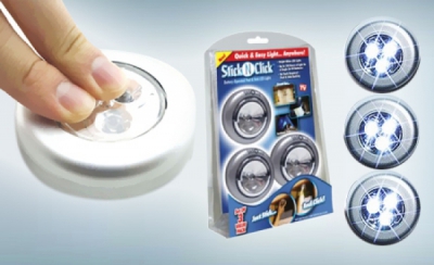 Не всегда целесообразно проводить свет в шкаф или устанавливать дополнительные лампы в комнатах и на чердаке. Для таких случаев проще всего использовать набор LED-светильников Stick N Click (Стик Н Клик). С ним Вам не понадобится посторонняя помощь в подключении, а также Вам не придется тянуть дополнительные провода через всю комнату. Каждый из светильников можно установить в любое нужное для Вас место всего за пару секунд.