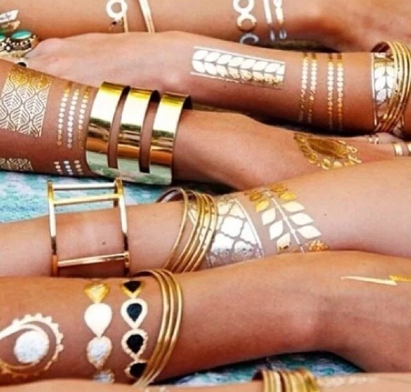 Shimmer Jewelry Tattoos - это временная татуировка, золотого или серебряного цвета, с гламурными узорами в индийском стиле, с эффектными рисунками в виде геометрических фигур, или просто цепей. Флеш тату имитируют ювелирные украшения-браслеты, кольца или колье, делая Ваш образ особенным, неотразимым. Золотые татуировки легко наносятся, держатся на теле от 3-х до 6 дней, удаляются любым косметическим маслом. Особенно шикарно Flash tattoo смотрятся на загорелом теле, они не заменимый аксессуар на пляже, с нашими флештату можно даже купаться. Это модно, красиво, доступно и абсолютно безопасно, не возможно не обратить внимания на такую красоту! Яркий образ и тысячи знаков внимания, изысканный стиль и шарм новизны - это Ваши спутники предстоящего летнего сезона!