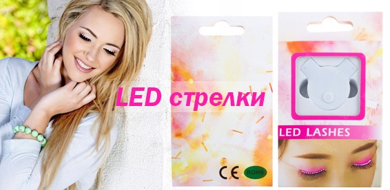 Бьюти новинка – светящиеся накладные стрелки. Гибкая основа стрелки покрыта 12 микро диодами, которые соединены с пультом управления незаметным проводком. Стрелки легко крепятся на веко обычным клеем для ресниц.