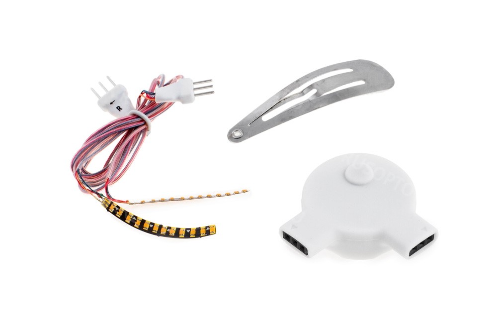 Пульт управления спрятан в силиконовый защитный чехол, который крепится под волосами на обычную гибкую заколку. Чтобы включить подсветку нужно зажать кнопку, и выбрать один из 3-х режимов свечения одноразовым нажатием.