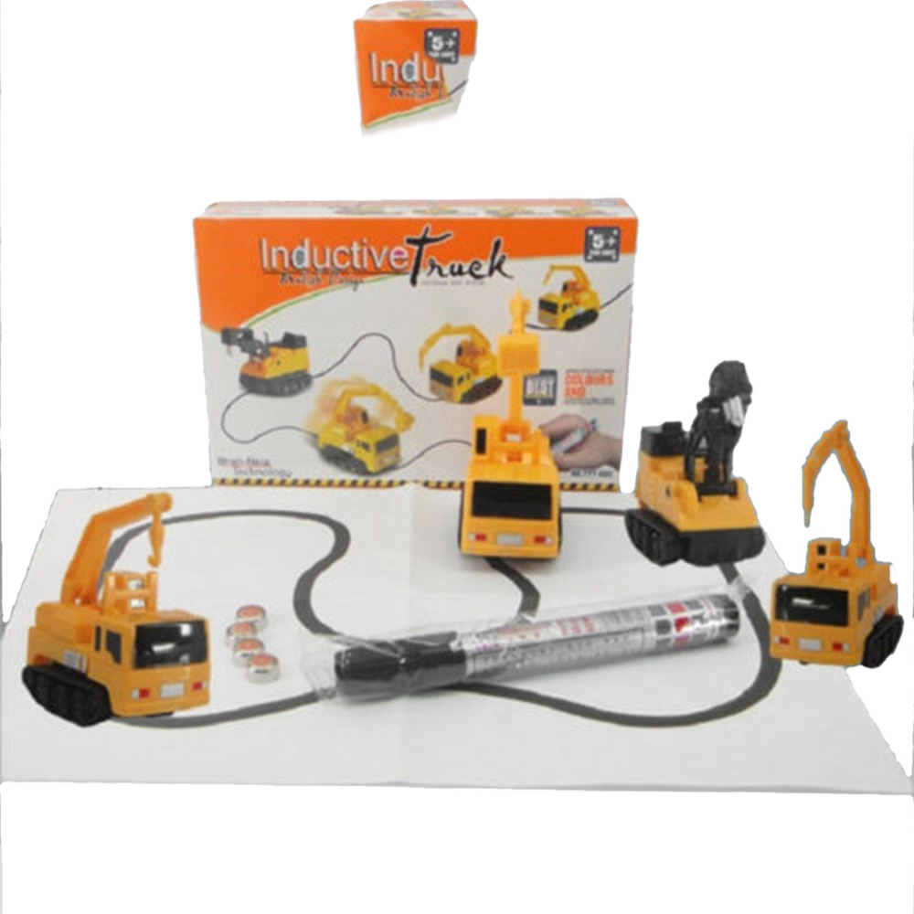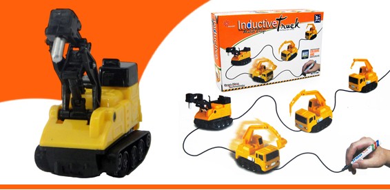 Индуктивный самодвижущийся экскаватор представляет собой мини-игрушку с оптическими датчиками и переключателями в днище. В комплект также входит черный маркер. Нужно просто нарисовать маркером толстую черную линию на поверхности белой бумаги, встроенный оптический датчик распознает нарисованную линию и экскаватор автоматически будет двигаться по линии.